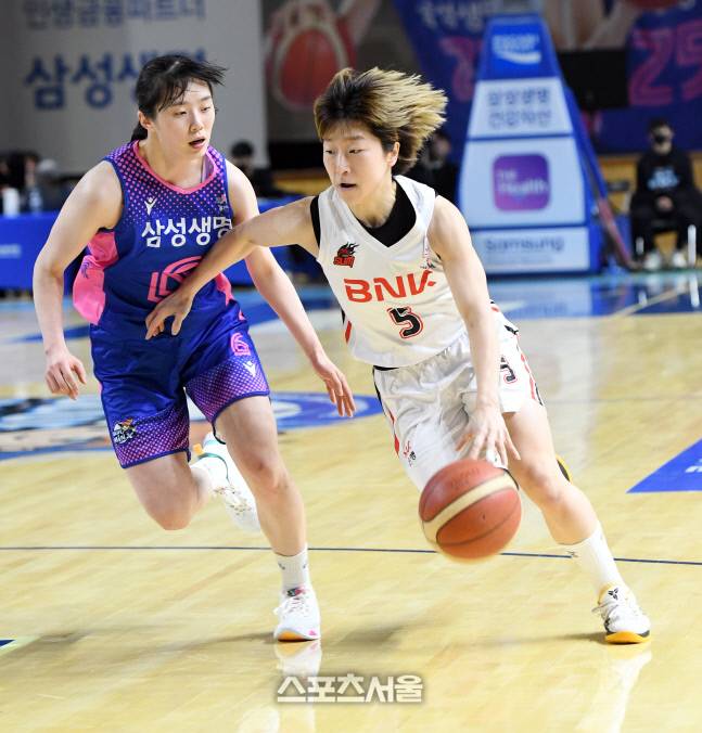 BNK썸 안혜지(오른쪽)가 8일 용인실내체육관에서 열린 2022-2023 여자프로농구 삼성생명과의 경기에서 드리블 돌파를 시도하고 있다. 2023. 2. 8.