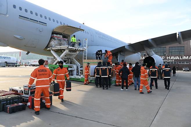 [서울=뉴시스] 고승민 기자 = 8일(현지시각) 튀르키예 가지안테프 공항에 도착한 대한민국 긴급구호단(KDRT) 수송기에서 단원들이 긴급구호물품들을 내리고 있다. (사진=국방부 제공) 2023.02.08. photo@newsis.com *재판매 및 DB 금지