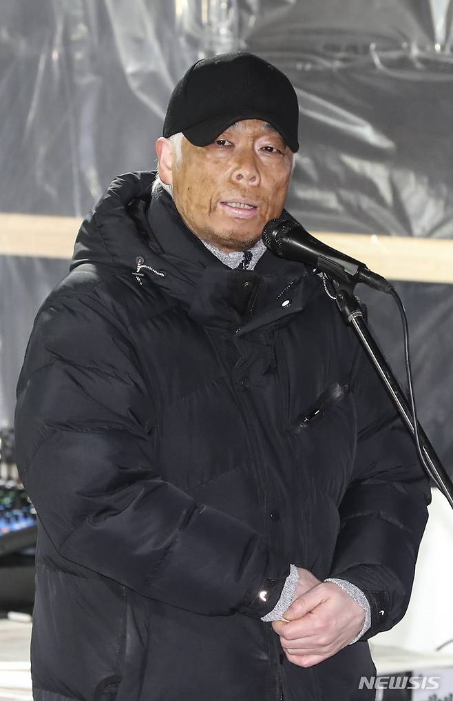 [서울=뉴시스] 김근수 기자 = 이종철 이태원참사 유가족협의회 대표가 8일 저녁 서울도서관 앞에서 열린 10.29 이태원 참사 추모 촛불문화제에서 발언하고 있다. 2023.02.08. ks@newsis.com