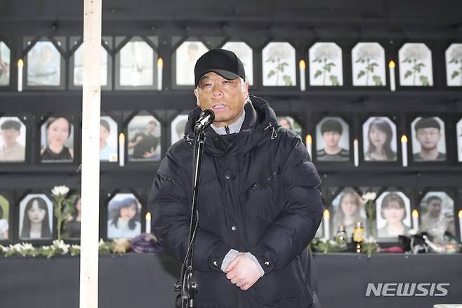 [서울=뉴시스] 김근수 기자 = 이종철 이태원참사 유가족협의회 대표가 8일 저녁 서울도서관 앞에서 열린 10.29 이태원 참사 추모 촛불문화제에서 발언하고 있다. 2023.02.08. ks@newsis.com