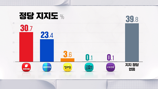 정당 지지도는 국민의힘 30.7%, 민주당 23.4%, 정의당 3.6% 순이었습니다.