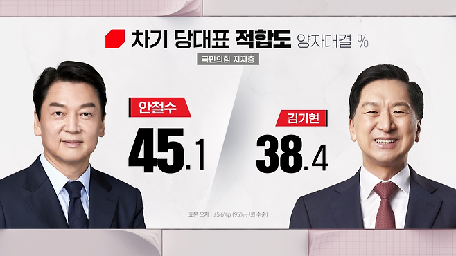 국민의힘 지지층의 표본 오차가 95% 신뢰 수준에서 ±5.6%포인트인 만큼 안철수, 김기현 의원이 오차 범위 안에서 양강 구도를 형성했습니다.