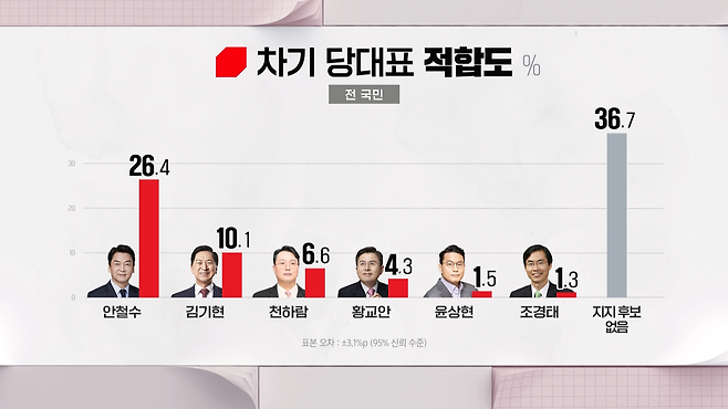 누가 당 대표로 적합한지 물었는데, 국민의힘 지지층에서는 안철수 의원과 김기현 의원이 오차 범위 안에서 경합하고 있는 것으로 조사됐습니다.