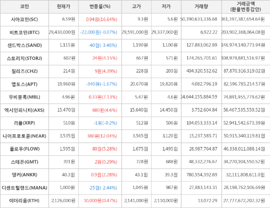 가상화폐 비트코인(-0.07%), 시아코인(+16.64%)