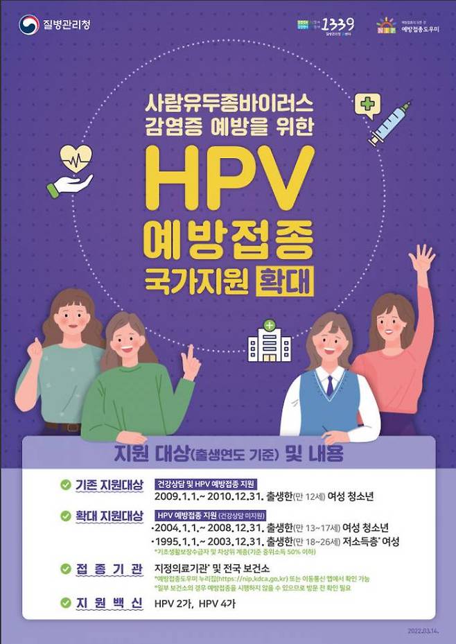 현재 국가예방접종사업으로 만12-17세(2005~2011년생)의 모든 여성청소년과 만18~26세(1996-2004년생)의 기초생활보장수급자와 차상위계층 등 저소득층 여성은 무료로 HPV 예방접종을 받을 수 있다.