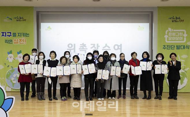 [이데일리 김태형] 김미경(오른쪽) 은평구청장이 8일 주민주도 자원순환 사업인 '은평그린모아모아' 자원관리사 및 코디네이터 발대식에서 위촉장을 수여하고 기념촬영을 하고 있다.