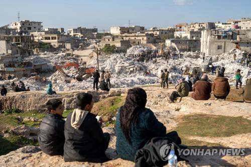 epa10455052 People watch rescuers and volunteers search for survivors under the rubble of collapsed houses, in Harim town near Idlib, Syria, 08 February 2023. More than 11,000 people have died and thousands more injured after two major earthquakes struck southern Turkey and northern Syria on 06 February. Authorities fear the death toll will keep climbing as rescuers look for survivors across the region. EPA/KARAM AL-MASRI