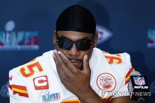 Kansas City Chiefs defensive tackle Chris Jones listens to a question during an NFL football Super Bowl media availability in Scottsdale, Ariz., Wednesday, Feb. 8, 2023. The Chiefs will play against the Philadelphia Eagles in Super Bowl LVII on Sunday. (AP Photo/Ross D. Franklin)