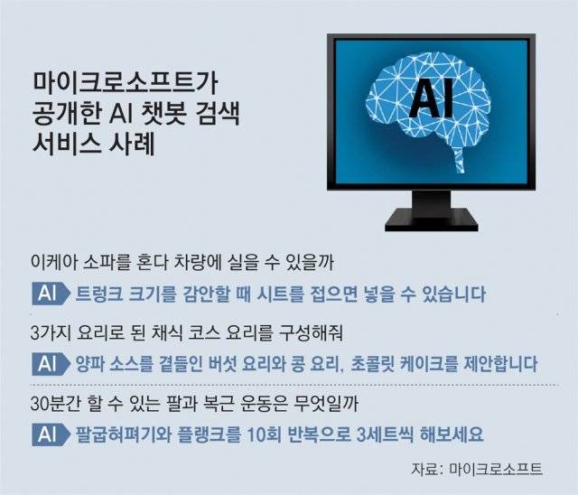 MS가 이날 발표한 새로운 버전의 ‘빙’은 이용자가 AI와 대화하듯이 정보를 얻을 수 있는 게 특징이다. 예를 들어 여행 계획을 세울 때 ‘멕시코시티에서의 5일 여행 일정을 만들어 달라’고 요청하고 이에 대한 답변 내용을 토대로 비용이나 날씨 등을 이용자가 추가로 질문해 답변을 확장해 가는 식이다. 검색창에 ‘이케아 클리판 러브시트 소파를 혼다 오디세이 2019년형 차량에 실을 수 있을까’라고 입력하면 소파와 차량 내부 크기 정보를 바로 찾아 계산한 뒤 ‘시트를 접으면 넣을 수 있다’는 답변을 내놓는다.
