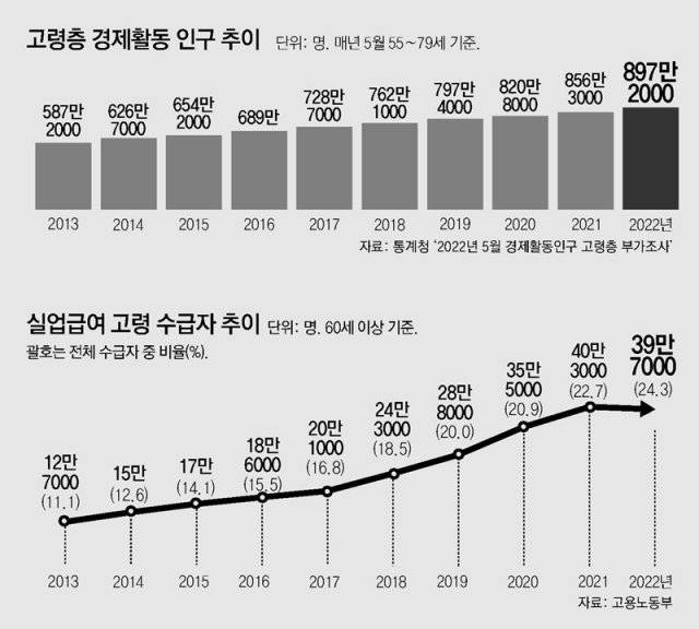 통계청에 따르면 국내 55∼79세 경제활동인구(5월 기준)는 2012년 554만 명에서 2022년 897만2000명으로 61.9% 늘었다. 지난해 55∼79세 인구 1509만8000명 중 연금을 받는 비율은 절반(49.4%)에 그쳤고, 이마저도 월평균 수령액이 69만 원에 불과했다.