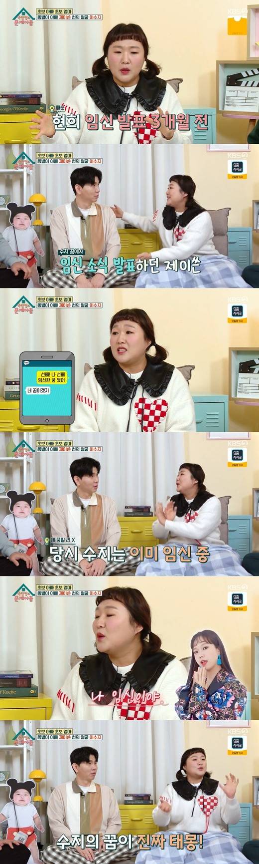이수지는 "현희 선배 임신 발표하기 두세 달 전쯤 제이쓴님이 '우리 현희 임신했어요' 하면서 더 행복해 하는 꿈을 꿨다. 현희 선배한테 '선배가 임신한 꿈 꿨어' 문자를 보냈더니 '네 꿈이겠지' 하더라"라고 했다.