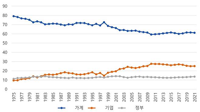 | ▲ [그래프 3] GDP가 가계, 기업, 정부 소득으로 분배되는 비중 (단위 GDP 대비 비중, %) 출처: 한국은행 경제통계시스템 정보 |