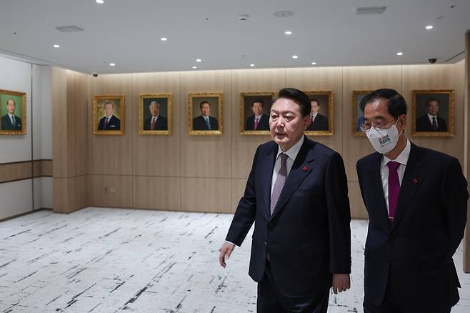 | ▲ 2022년 12월 13일 윤석열 대통령이 용산 대통령실 청사에서 열린 국무회의에 참석하며 한덕수 총리와 대화하고 있다. 전날 한 총리와의 주례회동에서 윤 대통령은 12월 임시국회에서 '법인세법 개정안'은 반드시 통과되어야 한다고 강조했다. |