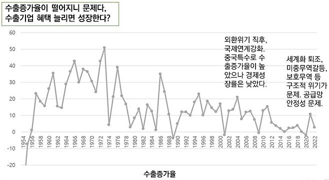 이것은 가격 효율성이라는 이유만큼이나 신뢰할만한 공급망이 수출에 영향을 미치기 시작했다는 것을 의미한다. 그런데 세계화 재편이라는 구조적 문제에 대해 윤석열 정부는 우리나라 수출 대기업이 '초격차'를 달성하면 된다는 식으로 더욱 강력한 노동규제 완화와 세율 인하 혜택을 몰아주려 하고 있다.