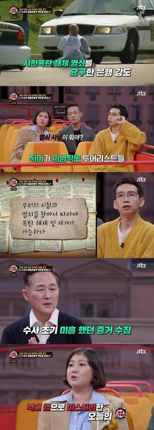 8일 방송된 JTBC '세계 다크투어'에서는 FBI 역사상 가장 기이한 은행 강도 사건이었던 ‘피자 바머’ 사건의 실체를 추적하며 시청자들의 추리 욕구를 한껏 자극했다. 특히 영화 ‘쏘우’의 모티브가 될 만큼 엄청난 반전을 자랑하는 이번 사건은 한순간도 방심할 수 없는 전개로 ‘세계 다크투어’의 마지막 페이지를 드라마틱하게 장식했다.