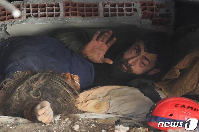 (하타이 로이터=뉴스1) 정윤미 기자 = 8일(현지시간) 튀르키예 하타이에서 한 남성이 대지진으로 무너진 건물 잔해에 깔린 채 손을 흔들고 있다. 2023.2.8
