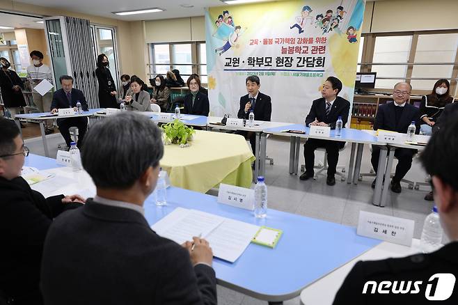(서울=뉴스1) 이승배 기자 = 이주호 사회부총리 겸 교육부 장관이 9일 오전 서울 서대문구 가재울초등학교에서 열린 교육·돌봄 국가책임 강화를 위한 늘봄학교 관련 교원·학부모 현장 간담회에 참석해 모두발언하고 있다. (공동취재) 2023.2.9/뉴스1
