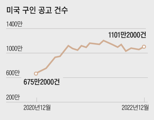미국 고용 시장이 견고한 흐름을 유지하고 있다. 최근 발표된 미 노동부 구인·이직보고서(JOLTS)에 따르면, 지난해 12월 미국에서 시장 전망치(1025만건)를 웃도는 1101만2000건의 구인 공고가 나왔다. 구인 공고 건수는 2021년 6월 이후 한 번도 1000만건 밑으로 떨어진 적이 없다. 이 밖에 신규 실업수당 청구 건수, 실업률, 비농업 신규 일자리 등 다른 지표도 일제히 예상치보다 좋은 ‘서프라이즈’를 기록했다.
