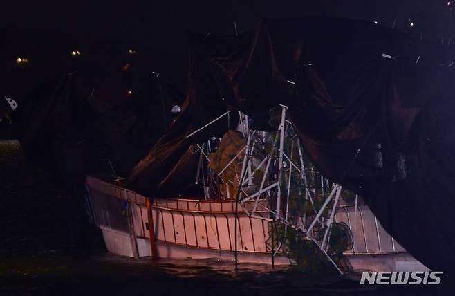 [목포=뉴시스] 이영주 기자 = 목포해경이 9일 오후 전남 목포시 목포해양경찰서 전용부두로 24t급 근해통발어선 청보호를 예인해오고 있다. 2023.02.09. leeyj2578@newsis.com