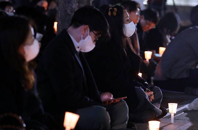 [서울=뉴시스] 조성봉 기자 = 9일 오후 서울 중구 시청 서울광장에 마련된 10.29 이태원참사 희생자 합동분향소 앞에서 열린 이태원참사 추모 촛불문화제에서 시민들이 촛불을 들고 있다. 2023.02.09. suncho21@newsis.com