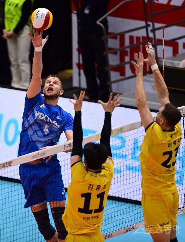 9일 경기도 의정부체육관에서 열린 ‘2022-2023 도드람 V-리그’ 남자부 의정부 KB손해보험과 수원 한국전력의 경기에서 한국전력 타이스가 KB손해보험 블로커 앞에서 밀어넣기 공격을 하고 있다.