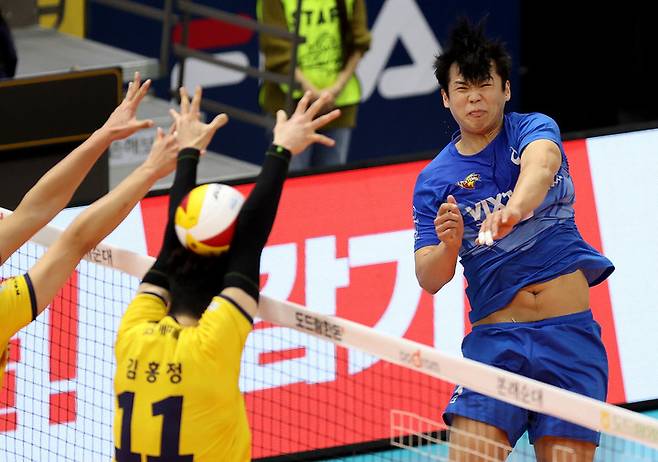 [서울=뉴시스] 정병혁 기자 = 9일 경기 의정부 실내체육관에서 열린 도드림 22-23 V리그 한국전력과 KB손해보험과의 경기, 한국전력 서재덕이 공격하고 있다.(사진=한국전력 배구단 제공) 2023.02.09. photo@newsis.com *재판매 및 DB 금지