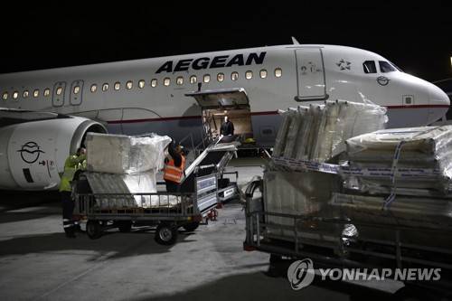 epa10456854 Employees of Aegean airlines load humanitarian aid on an airplane to Turkey, at the Eleftherios Venizelos international airport in Athens, Greece, 08 February 2023 (issued 09 February 2023). The first two flights bringing humanitarian aid to Turkiye, out of a total five that Greece is initially sending, arrived at dawn on February in Adana. In total, Greece is sending over 80 tons of humanitarian aid and may send more if it is needed. EPA/YANNIS KOLESIDIS