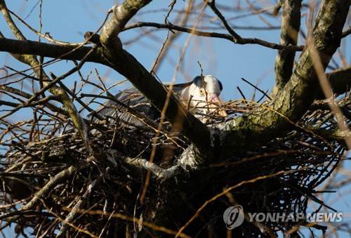 epa10457142 A wild heron peaks out from its nest at Alexandra Park in Oldham, Britain, 09 February 2023. Herons are some of the earliest nesters, laying eggs as early as the start of February, although early March is more common. EPA/ADAM VAUGHAN