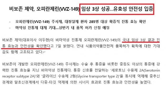거래소의 바이오 공시 가이드라인 개편으로 인한 안전성 누락은 최근 비보존제약 공시에도 적용됐다. 지난 7일 비보존은 ‘오피란제린 주사제 한국 임상 3상 유효성 1차평가항목 결과 발표’라는 제목으로 공시를 했다. 해당 공시에는 유효성을 평가하는 1차지표만 게시됐다. 안전성 데이터는 없다.