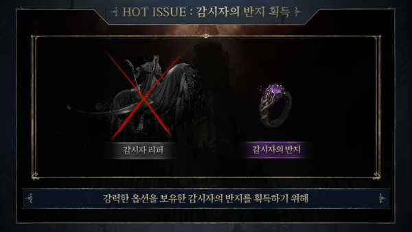 다음 이슈로 '감시자의 반지'가 소개됐다. 오만의 탑에 등장하는 '감시자 리퍼'가 드롭하는 '감시자의 반지'를 획득하기 위해 많은 유저들이 도전에 나섰다. 가장 먼저 반지를 획득한 유저는 판도라 월드의 '슈퍼셀'이었다. 지난달 8일 전체 월드 최초로 감시자의 반지를 획득한 것이 확인됐다.