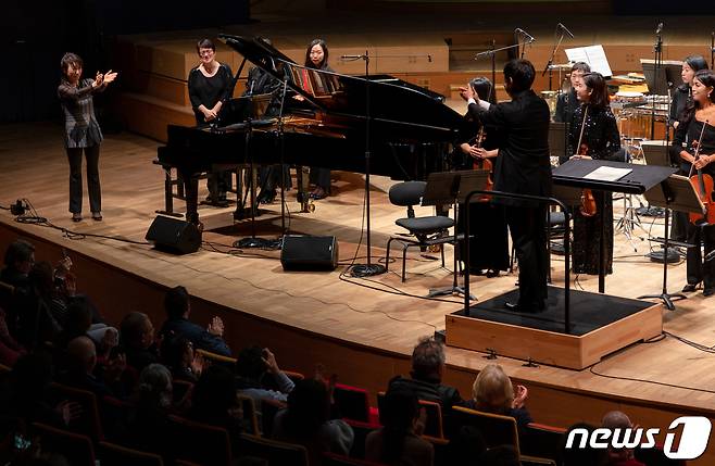 (파리=뉴스1) 이준성 기자 = 9일 밤(현지시간) 프랑스 파리 ‘라디오 프랑스 공연장(Maison de la Radio et de la Musique)’에서 ‘2023 프레장스 페스티벌(Festival Présences)’의 3번째 공연, ‘한국의 밤(Soirée Corée)’무대가 열려 작곡가 진은숙이 현대음악 전문연주단체 통영국제음악재단(TIMF) 앙상블이 연주한 자신의 곡 ‘구갈론-거리극의 장면들(GOUGALON - SCÈNES DE THÉÂTRE DE RUE)’의 연주가 끝나자 무대 위로 올라와 단원들과 인사를 하고 있다.