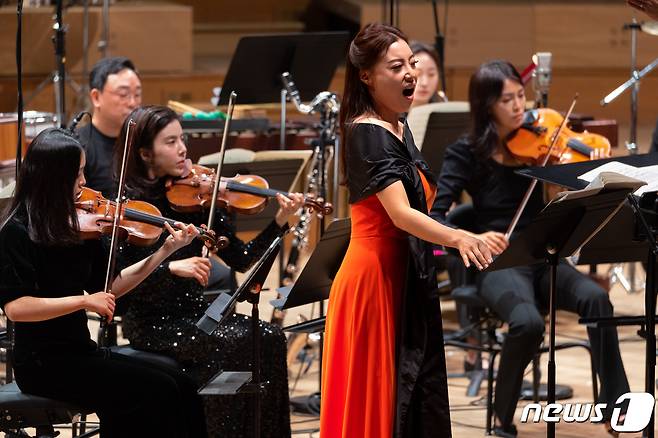 (파리=뉴스1) 이준성 기자 = 9일 밤(현지시간) 프랑스 파리 ‘라디오 프랑스 공연장(Maison de la Radio et de la Musique)’에서 ‘2023 프레장스 페스티벌(Festival Présences)’의 3번째 공연, ‘한국의 밤(Soirée Corée)’무대가 열려 현대음악 소프라노 황수미와 현대음악 전문연주단체 통영국제음악재단(TIMF) 앙상블이 작곡가 윤이상의 ‘밤이여 나뉘어라(TEILE DICH NACHT)’를 공연하고 있다.