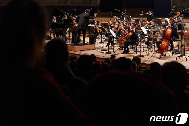 (파리=뉴스1) 이준성 기자 = 9일 밤(현지시간) 프랑스 파리 ‘라디오 프랑스 공연장(Maison de la Radio et de la Musique)’에서 ‘2023 프레장스 페스티벌(Festival Présences)’의 3번째 공연, ‘한국의 밤(Soirée Corée)’무대가 열려 현대음악 전문연주단체 통영국제음악재단(TIMF) 앙상블이 작곡가 진은숙의 ‘구갈론-거리극의 장면들(GOUGALON - SCÈNES DE THÉÂTRE DE RUE)’을 연주하고 있다.