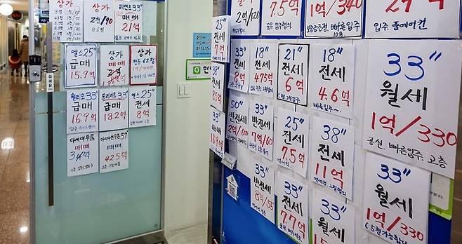 [3일 오후 서울 송파구 한 대형아파트 상가 내 부동산 업소에 게시된 전세와 매매가 (사진=연합뉴스)]
