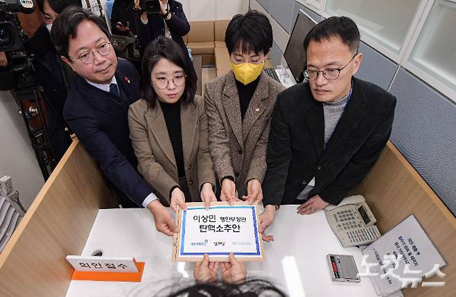 김승원 더불어민주당 의원(왼쪽부터), 용혜인 기본소득당 의원, 장혜영 정의당 의원, 박주민 더불어민주당 의원이 6일 서울 여의도 국회에서 이상민 행정안전부 장관에 대한 탄핵소추안을 의안과에 접수하고 있다. 윤창원 기자