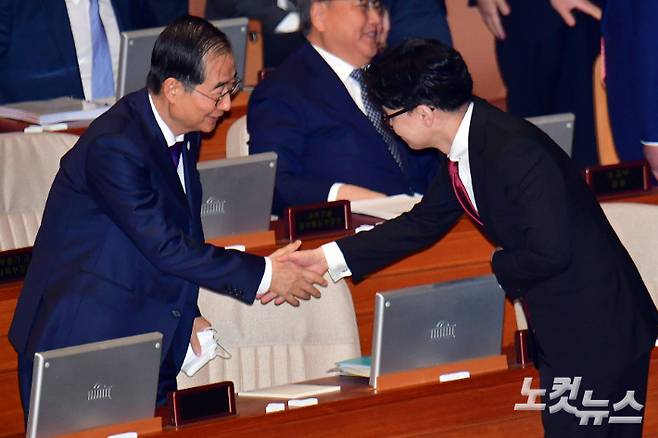 한덕수 국무총리와 한동훈 법무부 장관이 6일 서울 여의도 국회에서 열린 국회 본회의 정치·외교·통일·안보에 관한 대정부질문에 출석하며 인사를 하고 있다. 윤창원 기자