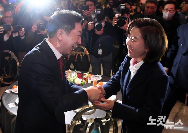 국민의힘 당권주자 김기현 의원과 나경원 전 의원이 9일 오후 서울 마포구 케이터틀에서 열린 사단법인 새로운민심 새민연 전국대회에 참석해 인사를 나누고 있다. 황진환 기자