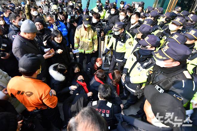 이태원 참사 희생자 유가족들이 6일 오전 서울시청 앞에서 오세훈 서울시장과의 면담을 요구하며 진입을 시도하고 있다. 유가족들과 시민단체는 참사 100일을 하루 앞둔 지난 4일 서울광장에 시민분향소를 기습 설치했다. 이에 서울시는 이날 오후 1시까지 분향소를 철거하지 않으면 행정대집행에 들어가겠다고 통보했다. 류영주 기자