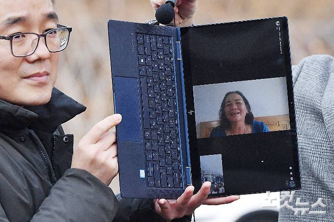 베트남전쟁 당시 한국군의 민간인 학살 피해 생존자인 응우옌 티탄 씨가 7일 오후 서울 서초구 서울중앙지법에서 열린 한국 상대 민사소송 1심 선고 공판에서 일부 승소한 뒤 화상 연결을 하고 있다. 이날 재판부는 피고 한국이 원고 응우옌티탄에게 3천만100원을 배상할 것을 선고했다. 응우옌티탄씨는 8살 때인 1968년 2월 한국군 청룡부대 소속 군인들의 총격으로 복부에 부상을 입고 가족들 역시 죽거나 다쳤다며 2020년 4월 한국을 상대로 손해배상 청구 소송을 제기했다. 류영주 기자