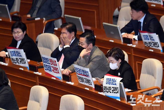 8일 오후 국회 본회의에 참석한 국민의힘 의원들이 이상민 행정안전부 장관 탄핵소추안 규탄 손피켓을 모니터에 부착하고 있다. 야 3당이 이태원 참사의 책임을 물어 발의한 이상민 행정안전부 장관 탄핵소추안이 이날 국회 본회의를 통과됨으로써 이 장관은 헌정 사상 첫 국무위원 탄핵 소추 사례가 됐다. 황진환 기자