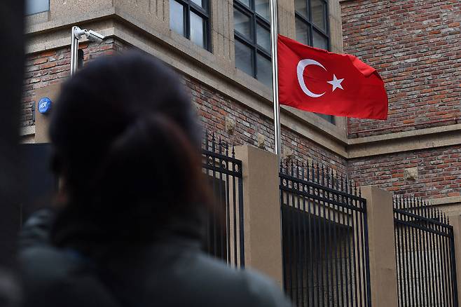 규모 7.8과 7.5의 두 차례 강진으로 인한 튀르키예와 시리아의 누적 사망자 수가 2만명을 넘어선 가운데 10일 서울 중구 주한 튀르키예 대사관에 조기가 걸려있다. 류영주 기자