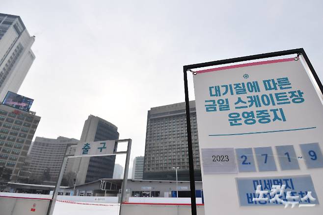 서울 등 수도권과 세종·충청·강원영서 지역에 미세먼지 비상저감조치가 내려진 가운데 7일 오전 서울 중구 서울광장 스케이트장에 운영 중지 안내문이 게시돼 있다. 류영주 기자