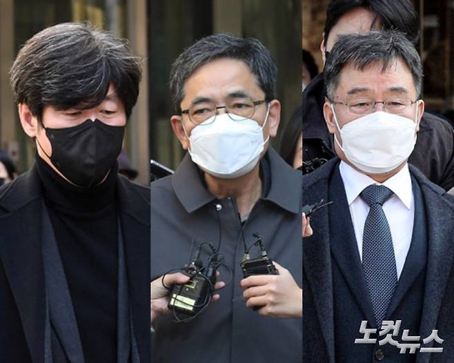 남욱 변호사, 곽상도 전 국민의힘 의원, 화천대유 대주주 김만배씨(왼쪽부터)가 8일 오후 서울 서초구 서울중앙지방법원에서 열린 대장동 개발 뇌물 혐의 관련 1심 선고 공판을 마치고 법원을 나서고 있다. 아들 퇴직금 등의 명목으로 50억원의 뇌물을 수수한 혐의로 재판에 넘겨진 곽상도 전 의원은 1심에서 무죄를 받았지만 정치자금법 위반 혐의에 대해서는 벌금형을 선고받았다. 곽 전 의원에게 각각 뇌물과 불법 정치자금을 건넨 혐의로 함께 기소된 화천대유 대주주 김만배씨는 무죄, 남욱 변호사는 벌금 400만원을 선고받았다. 류영주 기자