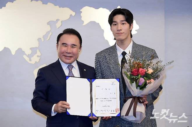 윤홍근 대한빙상경기연맹 회장이 9일 서울 송파구 제너시스BBQ 본사에서 전 쇼트트랙 국가대표 황대헌에게 2023 ISU 세계 쇼트트랙 선수권대회 홍보대사 위촉장을 전달한 뒤 기념 촬영을 하고 있다. 2023 ISU 세계 쇼트트랙 선수권대회는 오늘 3월 10일부터 12일까지 목동 아이스링크에서 열린다. 박종민 기자