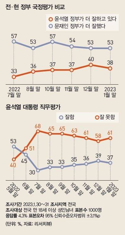 여론조사 전문기관 리서치뷰는 매달 말, 전국 만 18세 이상 성인남녀 1000명을 대상으로 여론조사를 한다. 일종의 정기조사다. 조사 항목 중 한 가지 주목할 만한 것이 있다. ‘전·현 정부 국정평가 비교’ 항목이다. 쉽게 말해 ‘윤석열 정부와 문재인 정부 중 국정운영을 어느 쪽이 더 잘하고 있다고 생각하느냐’는 질문이다. 새 정부 집권 후인 지난해 7월 말부터 시작한 조사는 그해 9월 한 차례를 제외하고 2023년 1월까지 매달 진행됐다.