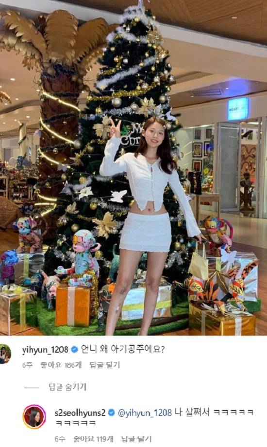 근황 게시물에 배우 조이현이 "언니 왜 아기공주에요?"라며 외모 칭찬 반응을 보이자, 설현은 "나 살쪄서 ㅋㅋㅋㅋ"라고 답글을 달기도 했다. 여전한 날씬한 몸매와 비주얼에 팬들은 "뭐가 살쪄!","살쪄도 예뻐요","살 찐 것 모르겠는데 망언" 등의 반응을 보였다.