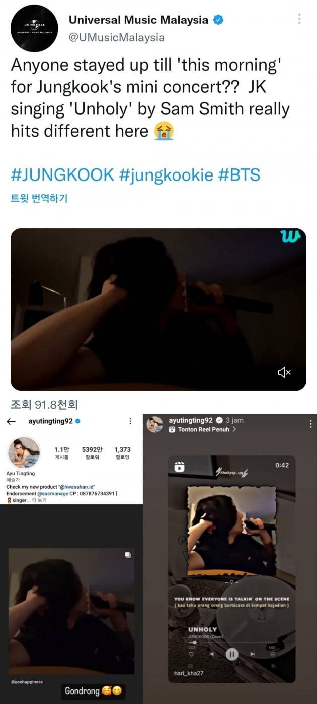 더불어 인스타그램 팔로워 5300만을 보유하고 있는 인도네시아 유명 가수 '아유 팅 팅'(Ayu Ting Ting)은 자신의 인스타그램스토리에 정국의 'Unholy' 라이브 영상을 2차례 업로드하며 푹 빠진 듯 열렬한 애정을 드러냈다.
