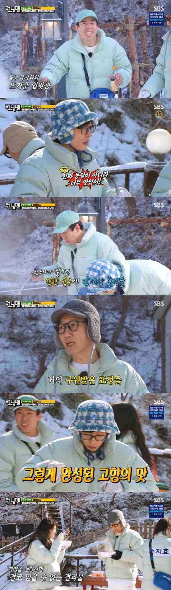 유재석, 지석진 등 멤버들은 육수 맛을 보며 "진짜 맛있다"면서 감탄을 연발했다.