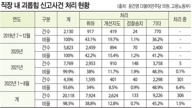 12일 시민단체 ‘직장갑질119’가 더불어민주당 윤건영 의원실을 통해 고용노동부에서 받은 자료에 따르면, 2019년 7월부터 지난해 8월까지 3년간 직장 내 괴롭힘 신고 건수는 총 2만424건으로 집계됐다. 처리된 사건을 유형별로 살펴보면 ▲취하(7천924건·38.8%) ▲개선지도(2천624건·12.8%) ▲검찰송치(133건·0.7%) ▲기타(9천226건·45.2%) 순으로 나타났다. 같은 기간 처리 중인 사건은 306건으로 1.5%였다.