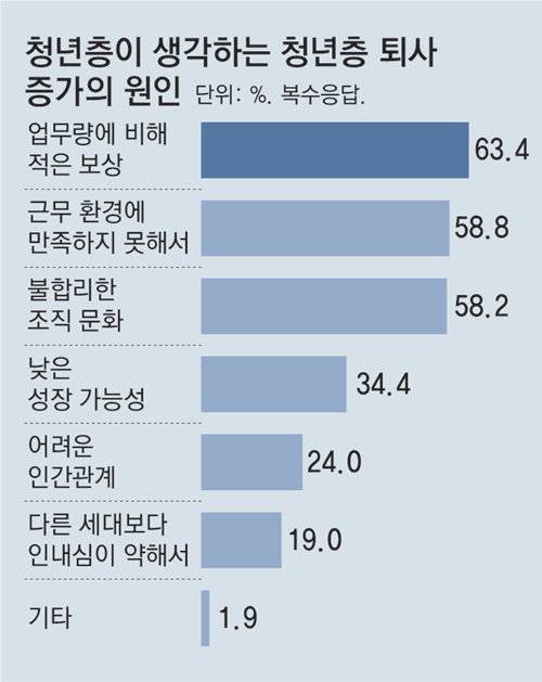 청년 퇴사 증가 원인에 대해 청년들은 ‘업무량 대비 낮은 보상’(63%)을 가장 큰 이유로 꼽았다. △근로 환경 불만족(59%) △불합리한 조직 문화(58%) △성장 기회 부족(34%) 등이 뒤를 이었다.